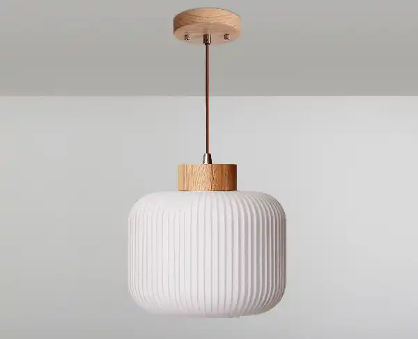 תלוי תקרה ג'ארה 30 מציע עיצוב אלגנטי בעץ וזכוכית חלבית, מתאים להארת חללים פנימיים כמו סלון או פינת אוכל.